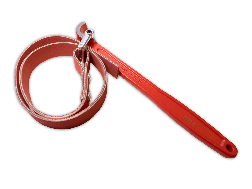 Усиленный ремешковый ключ VOLL для труб диаметром до 220 мм предназначен для бережной работы с пластиковыми и полированными трубами, трубами с мягким металлическим покрытием, фильтрами Ø до 220 мм (8"), а также с любыми поверхностями неправильной формы и скользкими поверхностями, обеспечивая надежный прочный захват без деформирований и повреждений, предотвращая царапины.